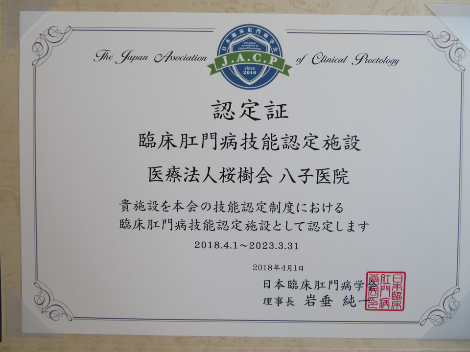 2018年4月からスタートした日本臨床肛門病学会:技能認定制度で当院が技能認定施設に認定されました。