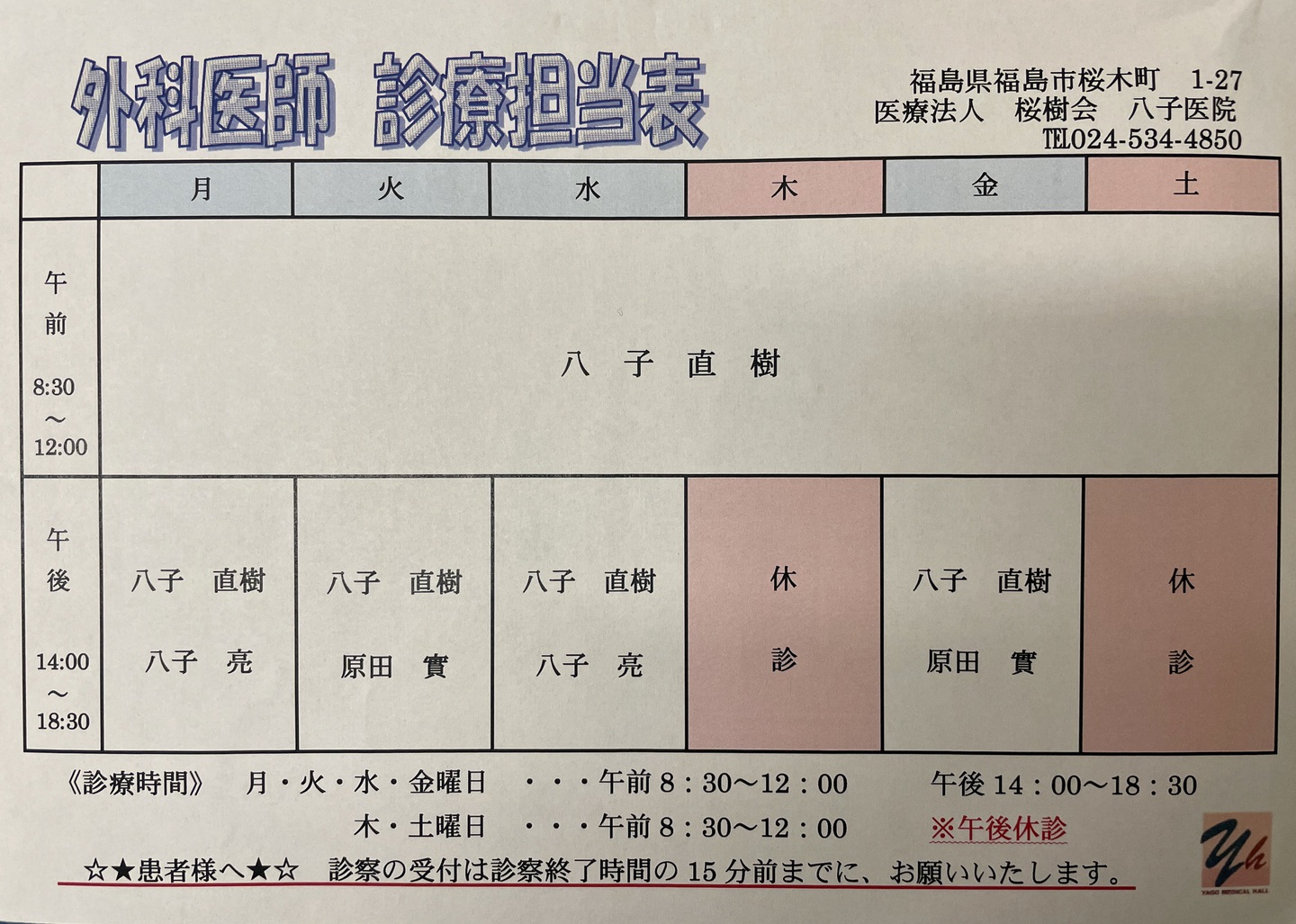 2025年10月16日 | <医師:外来診療のおしらせ> 外科、肛門科:八子 直樹:10月18日(土)は午前11時半までの診療となります。11月13日(木)〜15日(土)は学会出張のため不在となります。外科、肛門科は原田先生の外来となります。 |